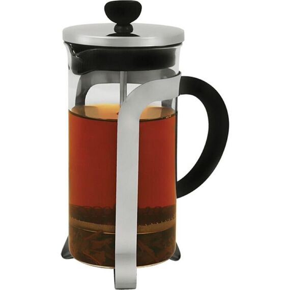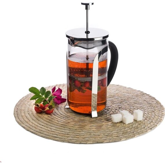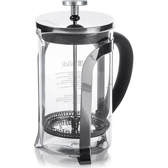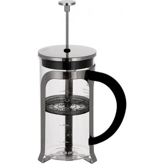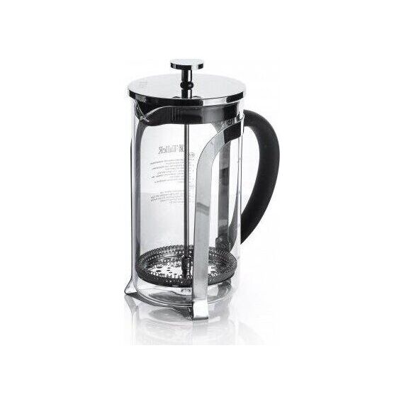 Френч-пресс 1000 мл, Berty Материалы: боросиликатное стекло, пластик, нержавеющая сталь. Толщины: стекло — 2,0 мм, детали пресс-фильтра — 0,3 мм Идеален для приготовления кофе, чая, тонизирующих и расслабляющих напитков Удобная ненагревающаяся ручка Разбо
