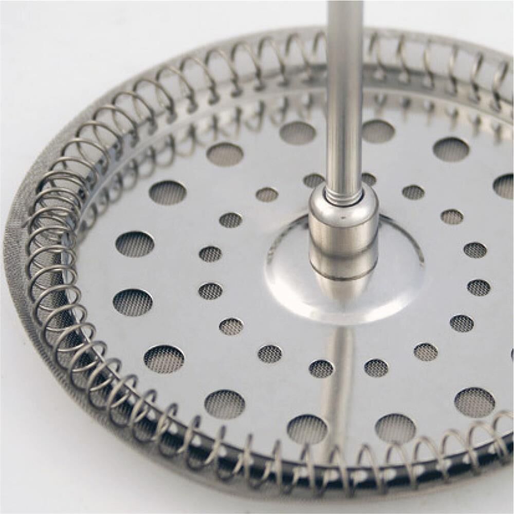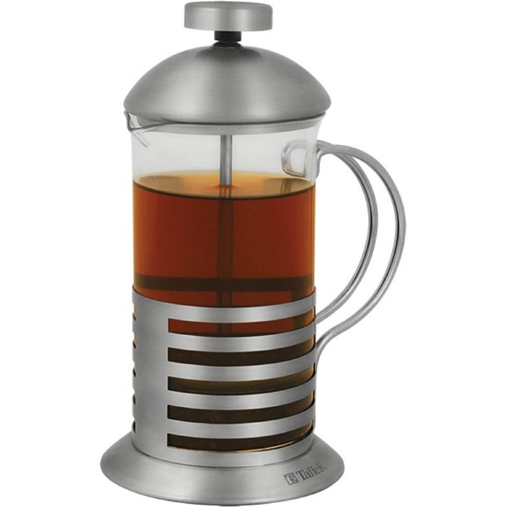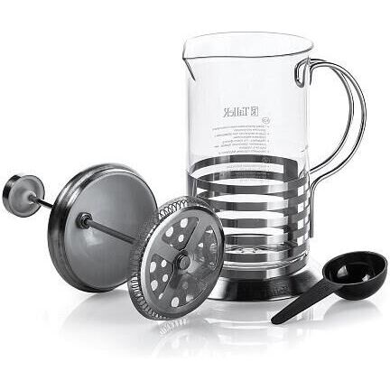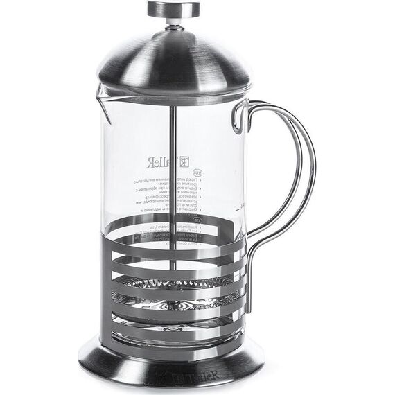 френч-пресс 600 мл, мерная ложка, буклет с рецептами Материалы: боросиликатное стекло, высококачественная нержавеющая сталь Толщины: стекло - 2,0 мм, подстаканник - 0,5 мм, детали пресс-фильтра - 0,3 мм Пригоден для мытья в посудомоечной машине