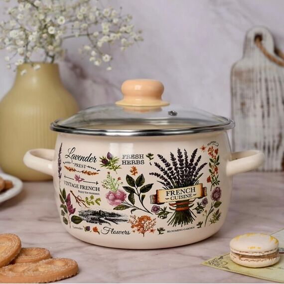 С нержавеющим ободком и стеклянной крышкой, в термоусадочной пленке Объем, л./размер, см: 3.0 л Материал: эмалированная сталь Толщина дна: 1.3 Толщина стенок: 1.3 Источник тепла: Все виды плит Тип упаковки: коллективная Крышка: стеклянная Внутреннее покрытие: эмаль Внешнее покрытие: эмаль