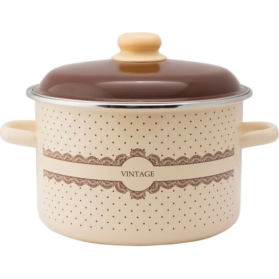 Кастрюля 5,5л цилиндрическая Vintage Материал эмалированная сталь. Толщина дна: 0.8 Толщина стенок: 0.8 Источник тепла: Все виды плит Крышка: эмалированная