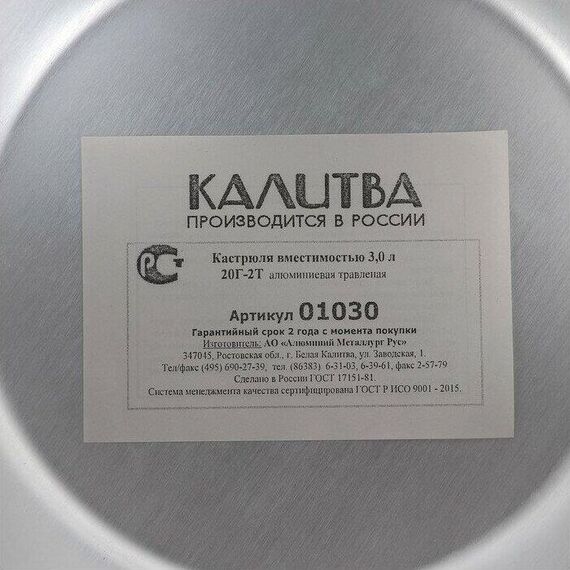 Кастрюля КАЛИТВА 1030 алюм сфер 3,0л