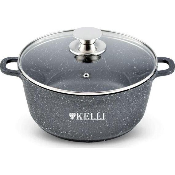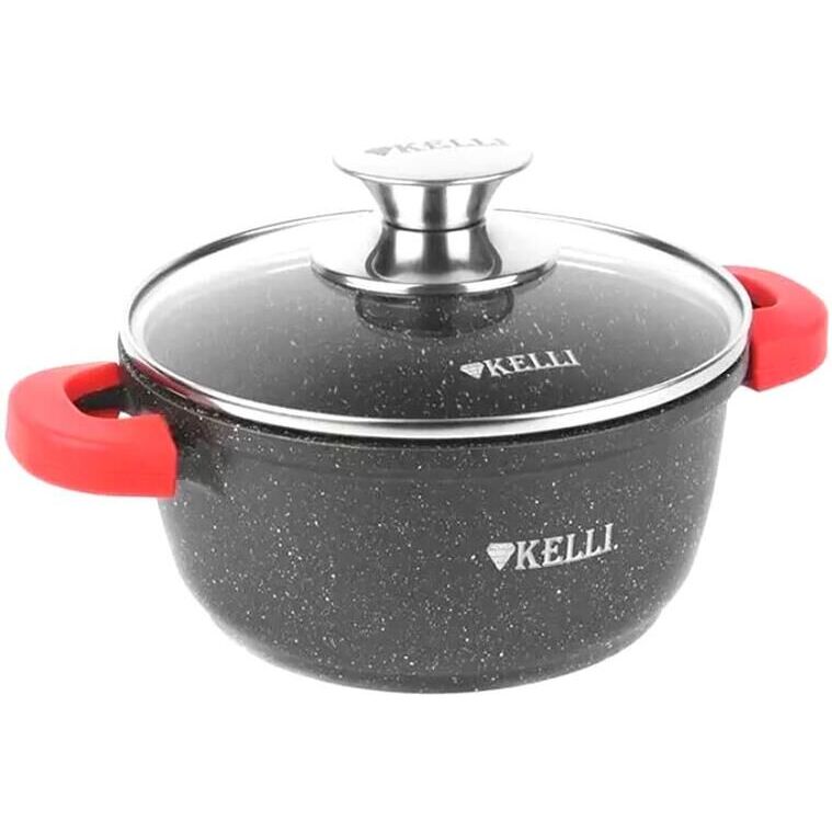 Кастрюля с мраморным антипригарным покрытием Объем: 4,5 л. Диаметр: 24 см. Индукционное дно. Материал: алюминий. Жаропрочная стеклянная крышка с паровыпуском. В комплекте силиконовые насадки на ручки. Пригодна для всех видов плит.