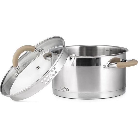 Материал - Нержавеющая сталь AISI 201. Полировка Комбинированная. Дно - Индукционное, Капсулированное. Мытье - В посудомоечной машине, Ручная мойка. Использование в духовке Нет. Отверстия для слива воды - 3 мм и 6 мм, сливной носик. Ручки - Нержавеющая сталь, Полые, Силиконовая отделка