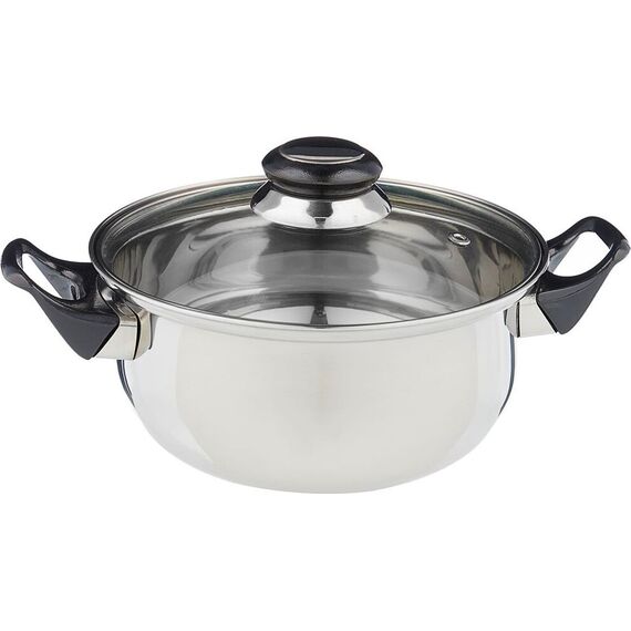 Кастрюля с крышкой 2,8 л (размеры: 20*9,5 см) Размер: 20*9,5 см Одинарное дно крышка из стекла ручки бакелит Толщина стенок - 0,28 мм Материалы: сталь, стекло, бакелит Упаковка: стрейч пленка + стикер