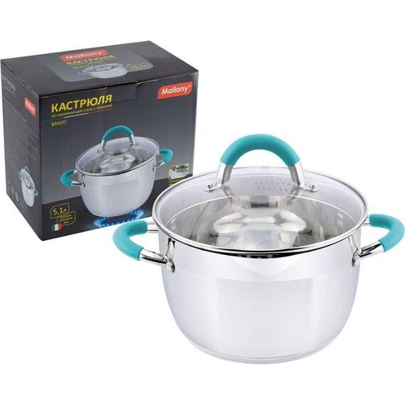 Кастрюля MALLONY BRAVO, объем 5,1 л, из нерж стали с крышкой из жаропрочного стекла, (005431)