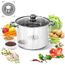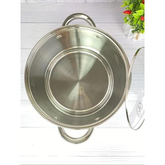 Дно 0,5мм алюминий + 1,5 мм железо + 0,5 мм алюминий, с одной степенью защиты ,Корпус цилиндрической формы Материал: нержавеющая сталь Стеклянная крышка в форме буквы С Клёпаные полые ручки из нержавеющей стали Ручка на крышке из нержавеющей стали Зеркальная полировка внутри и снаружи Внутри мерная шкала Дно толщиной 3 мм