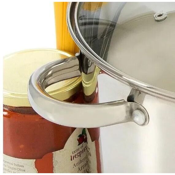 Дно 0,5мм алюминий + 1,5 мм железо + 0,5 мм алюминий, с одной степенью защиты ,Корпус цилиндрической формы Материал: нержавеющая сталь Стеклянная крышка в форме буквы С Клёпаные полые ручки из нержавеющей стали Ручка на крышке из нержавеющей стали Зеркальная полировка внутри и снаружи Внутри мерная шкала Дно толщиной 3 мм