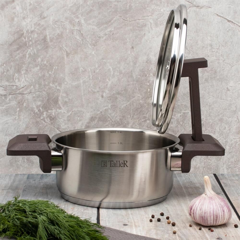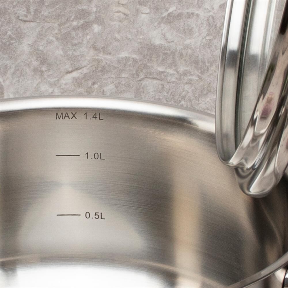 Кастрюля 1,4л с крышкой, диаметр 16 см, высота без крышки 7,8 см, внешний диаметр дна 14,5 см ,ширина с ручками 29 см. Толщина стенок 0.5 мм, толщина дна 3,5 мм Материал: нержавеющая сталь Подходит для всех типов плит, в т.ч. индукционной Можно мыть в