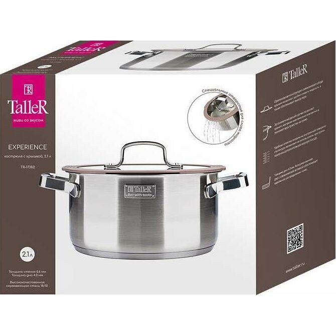 Кастрюля Experience с крышкой, 2,1 л Материал: нержавеющая сталь 18/10 Комбинированная крышка из закаленного стекла с силиконовым ободом оригинальной конструкции , цвет крышки 409С Удобные отметки литража на внутренней поверхности посуды Капсулированное