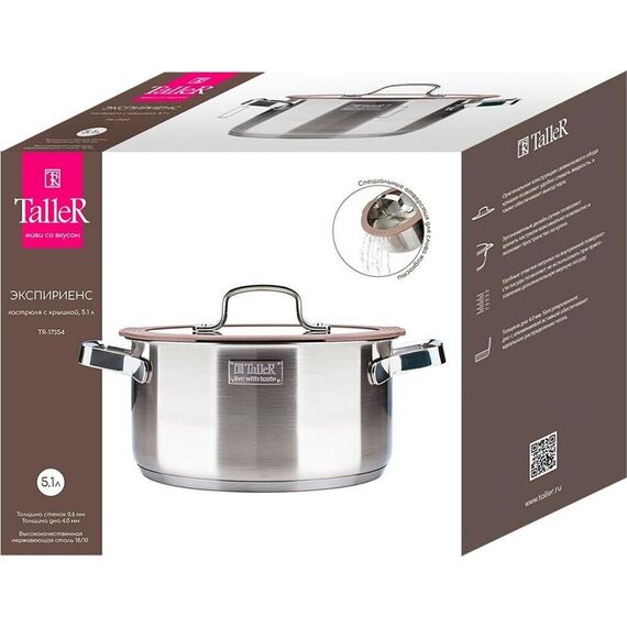 Кастрюля Experience с крышкой, 5,1 л Материал: нержавеющая сталь 18/10 Комбинированная крышка из закаленного стекла с силиконовым ободом оригинальной конструкции , цвет крышки 409С Удобные отметки литража на внутренней поверхности посуды Капсулированное д