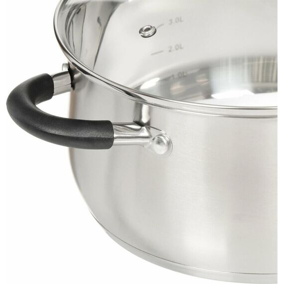Кастрюля с крышкой "Шелборн", (3,2 л), 20*10,5 см Толщина стенки — 0,6мм. Толщина дна 2.8мм. Полировка внешняя — матовая, внутренняя — зеркальная. Крышка из жаропрочного стекла со стальным ободом с отверстием для выхода пара. Комбинированные ручки с силик