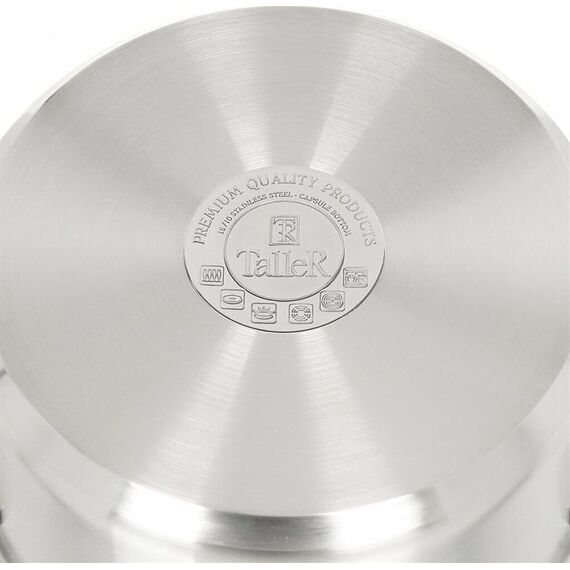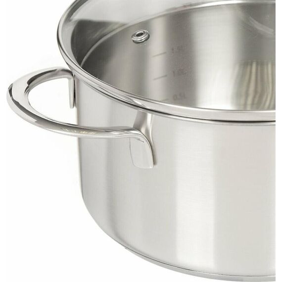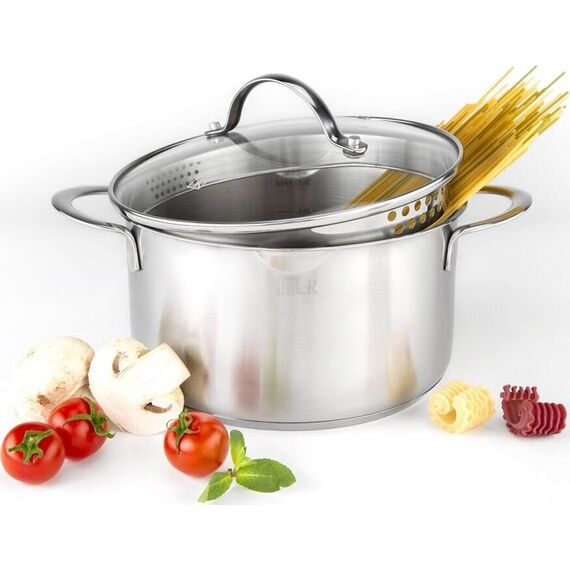 Сталь 18/10, толщина дна/стенки 4,0/0,6мм, сливной носик, крышка с перфорацией для удобного слива жидкости. Ручки из нержавеющей стали. Отметки емкости на внутренней стенке кастрюли, матовая внутренняя и внешняя полировка. Упаковка: цветная коробка. Разме
