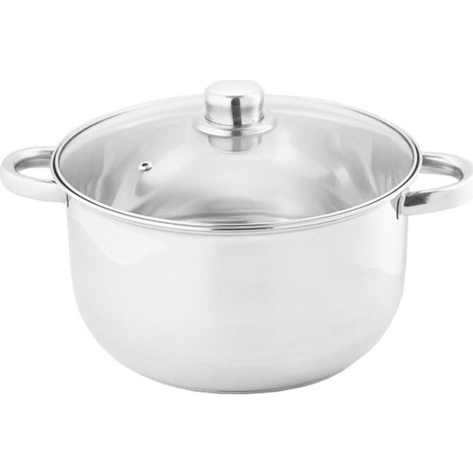 Объем 5,8 л. Диаметр 24 см. Глубина 13.5 см. Толщина стали 0,3 мм. Кастрюля из высококачественной нержавеющей стали. Специальная форма, исключающая скопление остатков пищи и жира. Обод, препятствующий переливанию жидкостей через край. Термосберегающее дно с повышенной термоотдачей. Стеклянная крышка с отверстием для отвода пара позволяет поддерживать оптимальный процесс нагрева. Металлические ручки. Быстрый нагрев пищи, длительное удержание тепла.