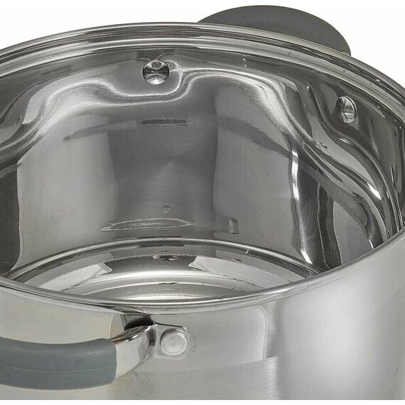 Параметры Объем 6,6 л Диаметр 24 см Глубина 14,5 см Толщина стенок 0,5 мм Описание Кастрюля из высококачественной нержавеющей стали со стеклянной крышкой Специальная форма, исключающая скопление остатков пищи и жира Термосберегающее дно: пятислойное капсульное индукционное дно с повышенной термоотдачей Быстрый нагрев пищи, длительное удержание тепла Минимальные потери минеральных веществ, витаминов и вкусовых качеств Может быть использована на всех типах кухонных плит, включая индукционные Подходит для мытья в посудомоечной машине