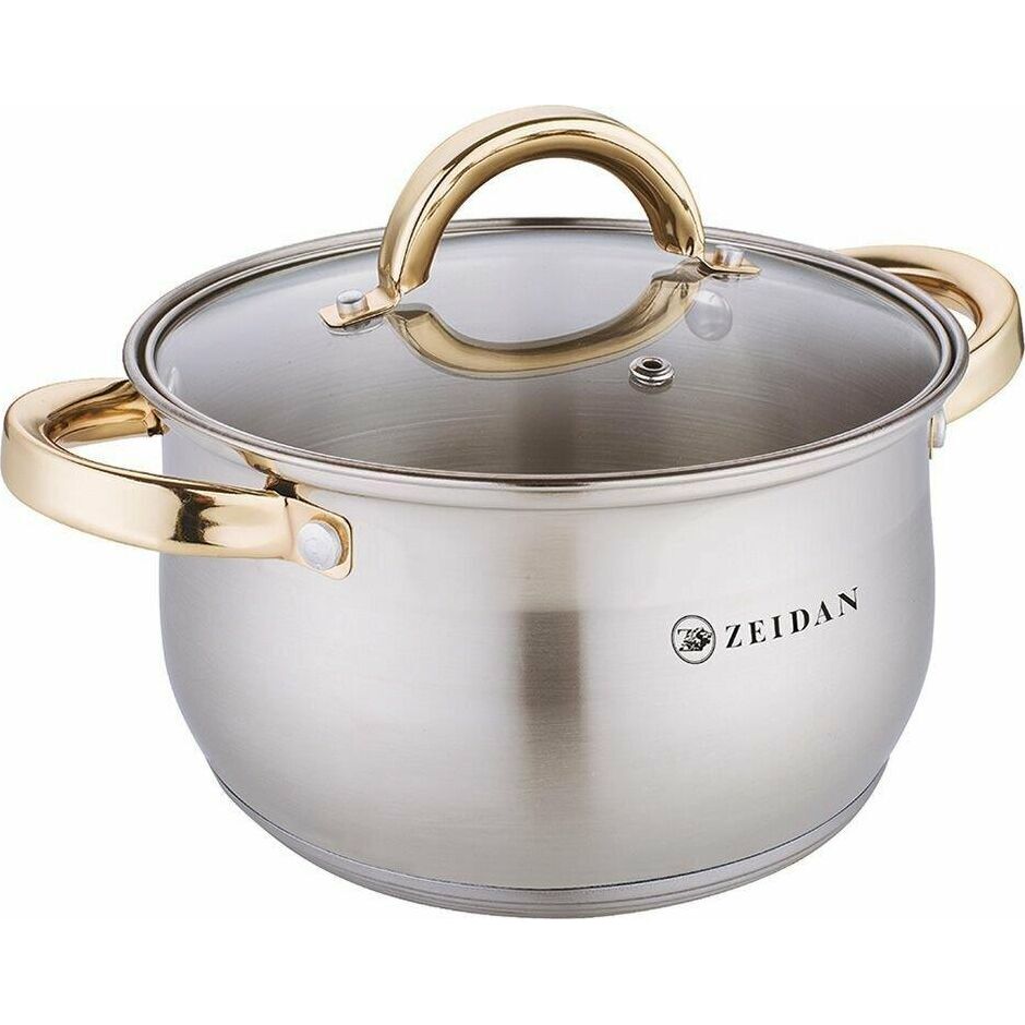 Кастрюля ZEIDAN Z-501078 3,0 л с крышкой, Кастрюля со стеклянной крышкой - 3,0 Л (Ø18 см), нержавеющая сталь, 5-ти СТЕПОВОЕ КАПСУЛИРОВАННОЕ ИНДУКЦИОННОЕ ДНО, крышка - стекло, ручки на корпусе и крышке "ПОД ЗОЛОТО", комбинированная полировка снаружи, матовая полировка внутри. Подарочная упаковка.