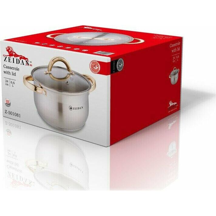 Кастрюля ZEIDAN Z-501081 6,6 л с крышкой, Кастрюля со стеклянной крышкой - 6,6 Л (Ø24 см), нержавеющая сталь, 5-ти СТЕПОВОЕ КАПСУЛИРОВАННОЕ ИНДУКЦИОННОЕ ДНО, крышка - стекло, ручки на корпусе и крышке "ПОД ЗОЛОТО", комбинированная полировка снаружи, матовая полировка внутри. Подарочная упаковка.