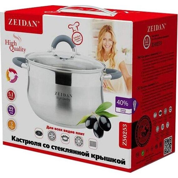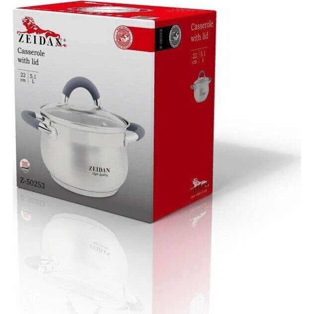 Кастрюля со стеклянной крышкой - 5,1 л (O22х13.5 см), нерж.сталь, внутренняя - матовая полировка, снаружи - комбинированная полировка, шкала литража, ручки с силиконовым покрытием, КАПСУЛИРОВАННОЕ ДНО, ПОДАРОЧНАЯ УПАКОВКА С ПЛАСТИКОВОЙ РУЧКОЙ.
