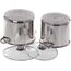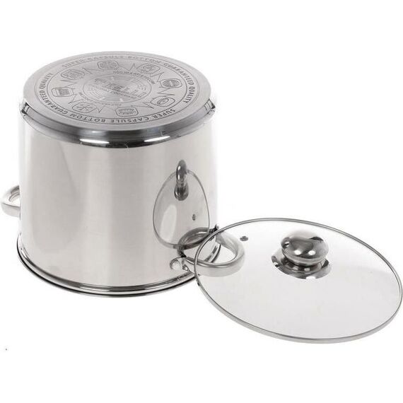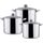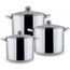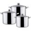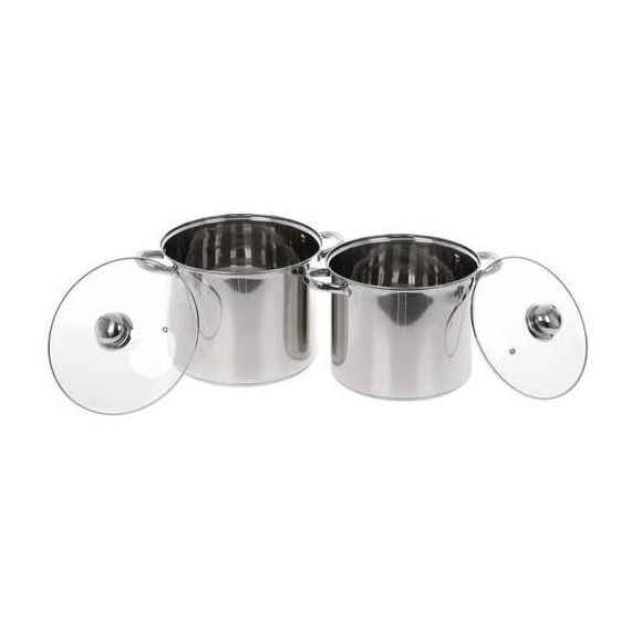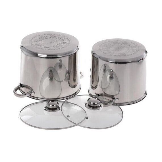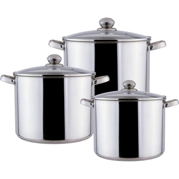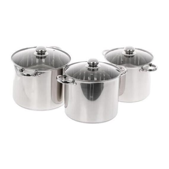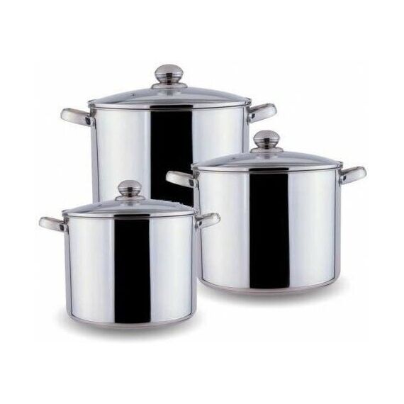 Набор посуды из 6 предметов Кастрюля с крышкой 7,5 л Диаметр: 19 см Кастрюля с крышкой 9,5 л Диаметр: 20 см Кастрюля с крышкой 12 л Диаметр: 21 см Высококачественная нержавеющая сталь 18/10. 3х-слойное капсульное дно. Зеркальная полировка. Можно использовать на всех типах плит включая индукционную. Стеклянные крышки с паровыпуском. Удобные клепаные ручки не нагреваются. Посуда пригодна для мытья в посудомоечной машине.