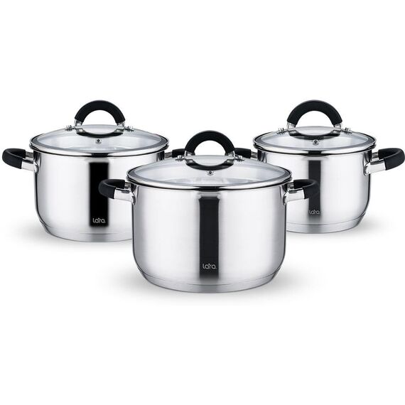 Набор посуды LARA серии «Ника» – это сочетание современного стиля и высокого качества исполнения. Кастрюли выполнены из нержавеющей стали и отличаются надежностью и прочностью. Толстое пятислойное капсулированное дно обеспечивает равномерный нагрев и длит