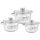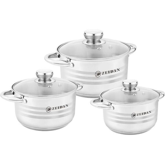 Набор посуды, 6 предм. (3 КАСТРЮЛИ С КРЫШКАМИ: 1.7 Л (d16 см ), 3.4 Л (d20 см ), 5.9 Л (d24 см ), нержавеющая сталь, 5-ти СТЕПОВОЕ КАПСУЛИРОВАННОЕ ДНО, крышки - стекло, внутренняя - зеркальная полировка корпуса, снаружи – комбинированная полировка корпуса.