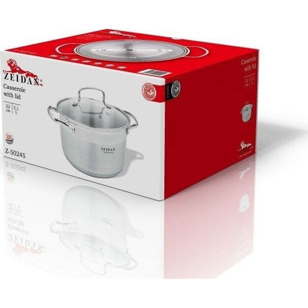 Кастрюля со стеклянной крышкой 5,1 л (д.22х13.5 см), нерж.сталь, внутри и снаружи -зеркальная полировка, шкала литража, 5-ти слойное КАПСУЛИР. ДНО, ПОДАРОЧНАЯ УПАКОВКА С ПЛАСТИКОВОЙ РУЧКОЙ.