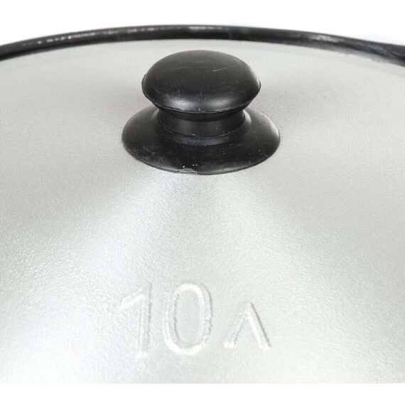 Материал: чугун Объем: 10 л Алюминиевая крышка 4 литые чугунные ручки Толщина стенок 7мм Подходит для всех типов плит, включая индукционные