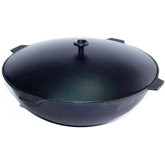 Материал: чугун; Объем: 10 л; Диамент: 410 мм; Алюминиевая крышка; 4 литые чугунные ручки; Подходит для всех типов плит, включая индукционные
