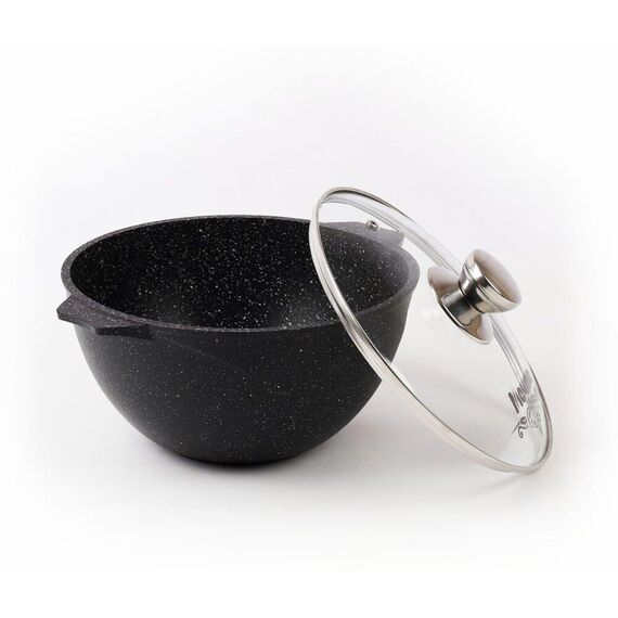 Казан для плова 5л с антипригарным покрытием и стеклянной крышкой серии "Гранит black" Подходит для всех типов плит, кроме индукционных. Можно использовать в посудомоечной машине.