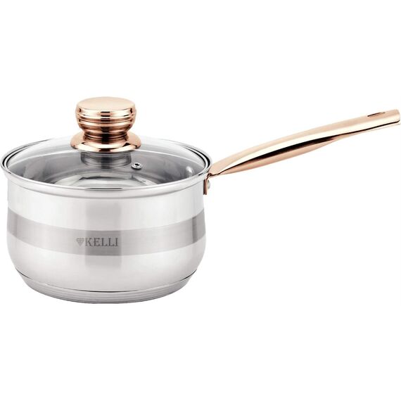 Ковш из нержавеющей стали с крышкой; Объем: 1,3л; Размер: 14*8,5 см; Высококачественная нержавеющая сталь; Капсульное дно; Зеркальная+матовая полировка; Стеклянная крышка с паровыпуском; Удобная термостойкая клепаная ручка; Подходит для всех видов плит