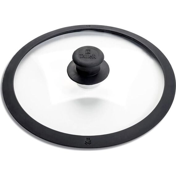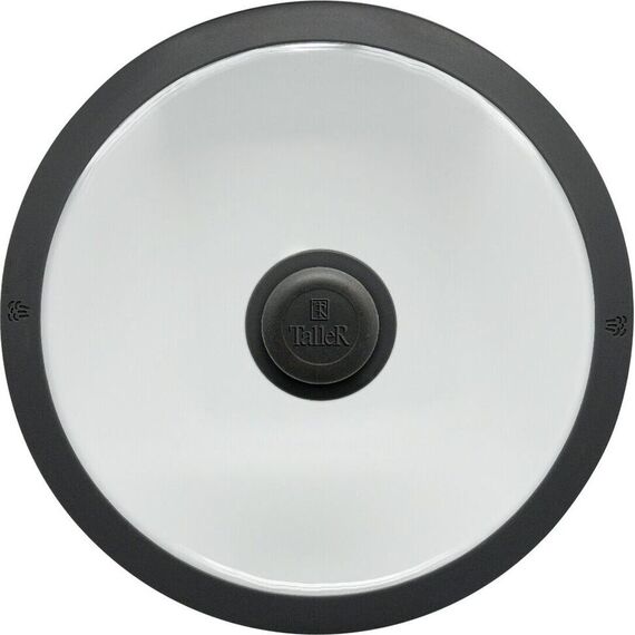 Крышка из жаропрочного стекла, диаметр 26см. Силиконовый обод с отверстиями для паровыпуска, силиконовая ручка. Нельзя использовать в духовке.