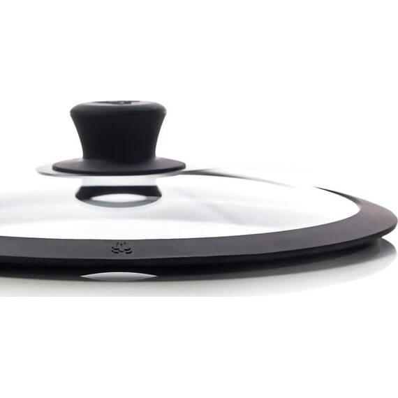 Крышка из жаропрочного стекла, диаметр 28см. Силиконовый обод с отверстиями для паровыпуска, силиконовая ручка. Нельзя использовать в духовке.
