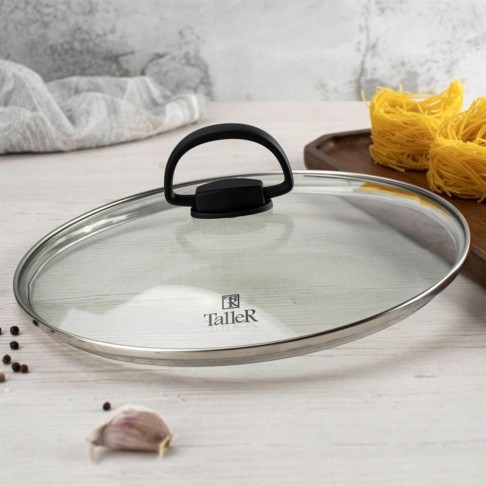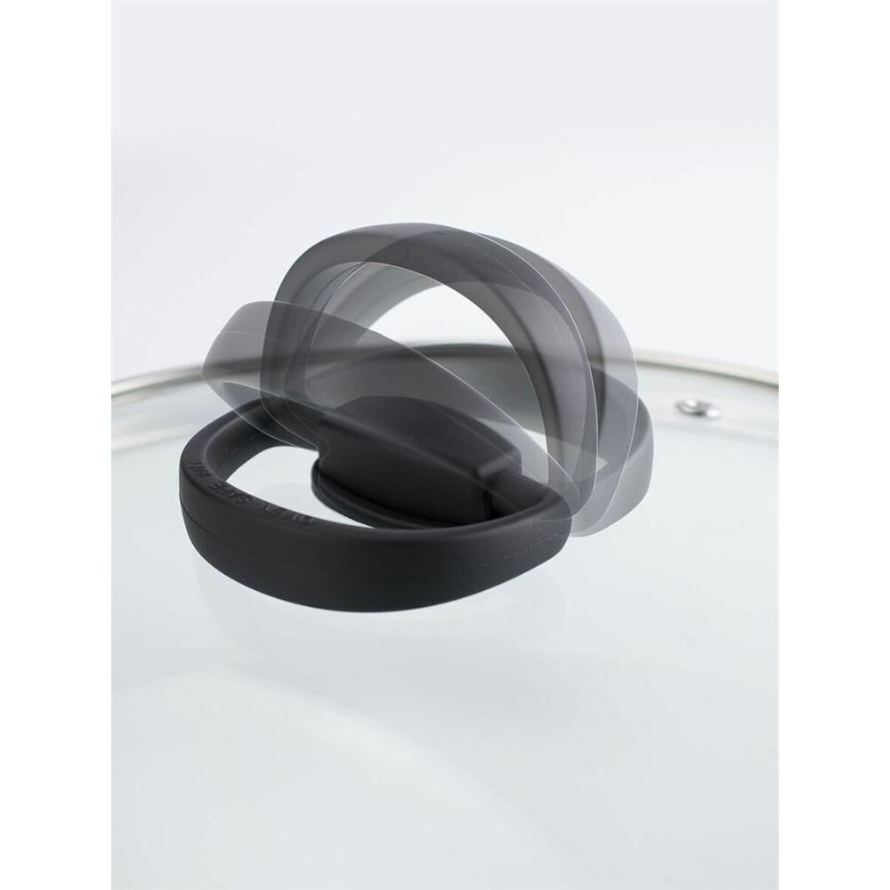 Крышка диаметром 28 см, со складывающейся ручкой с покрытием soft-touch. Внешний диаметр 292 мм, внутренний диаметр 277 мм, высота 40 мм. Состав: термостойкое стекло, нержавеющая сталь, нейлон. Нельзя использовать в духовке, микроволновке. Можно быть в п