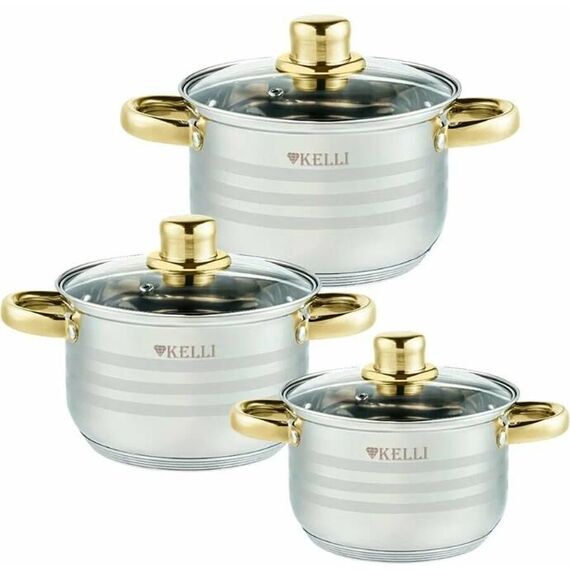 Набор из 6 предметов; Материал: нержавеющая сталь; Кастрюля 2л со стеклянной крышкой, диаметр: 16 см; Кастрюля 2,5л со стеклянной крышкой, диаметр: 18 см; Кастрюля 3,5л со стеклянной крышкой, диаметр: 20 см; Удобные клепаные ручки не нагреваются; Крышки с паровыпуском; 5-ти слойное капсульное дно; Мерная шкала; Подходит для всех видов кухонных плит