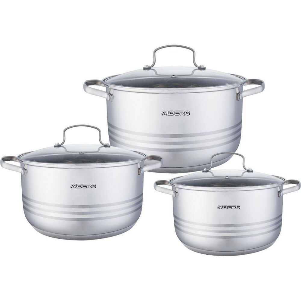 Набор кастрюль состоит из 6 предметов: 3 кастрюли, 3 крышки Кастрюля 7.6 л (Ø26 х 15.0 см) Кастрюля 9.8 л (Ø28 х 16.5 см) Кастрюля 12.0 л (Ø30 х 17.5 см) Мерная шкала в каждой кастрюле Толщина стенки 0.5 мм Высококачественная нержавеющая сталь Многослойное термоаккумулирующее капсулированное индукционное дно Крышки из жаропрочного стекла с отверстием для выхода пара Подходит для всех видов плит, включая индукционные Нельзя использовать в духовом шкафу Подходит для мойки в посудомоечной машине