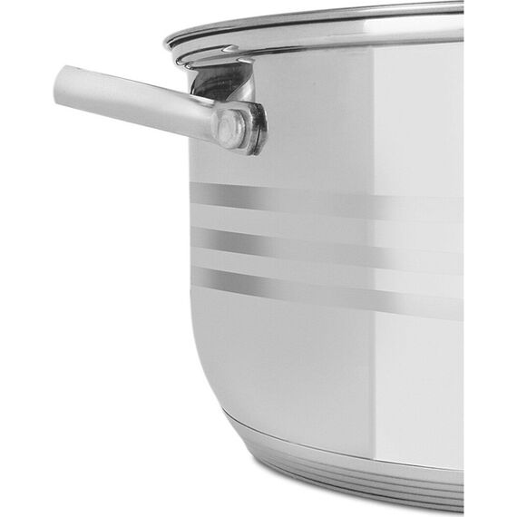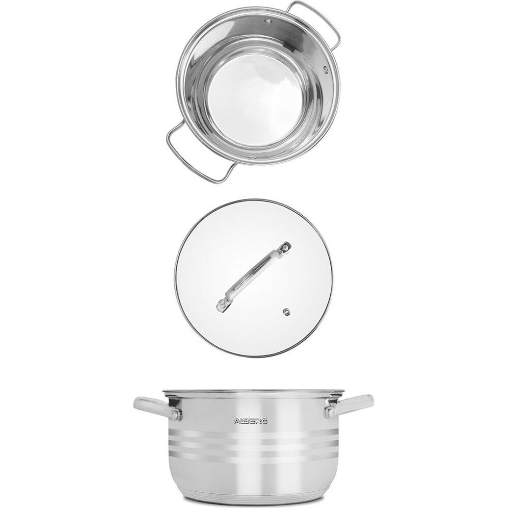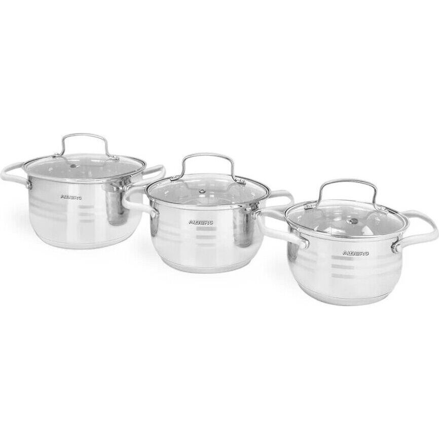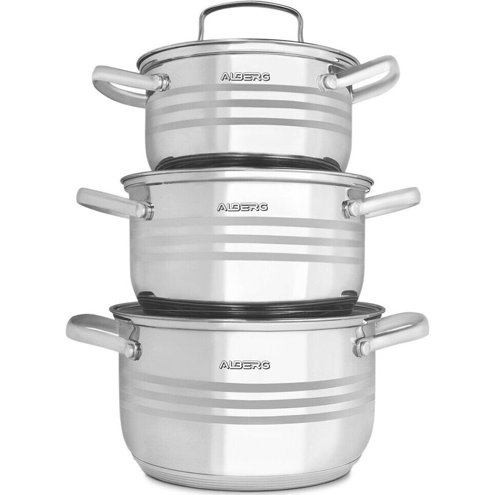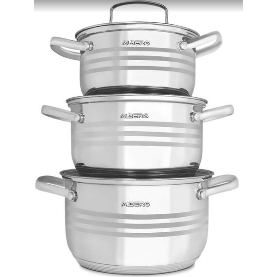 Набор состоит из 6 предметов: 3 кастрюли, 3 крышки Кастрюля 2 л (16 х 10,5 см) Кастрюля 3 л (18 х 11,5 см) Кастрюля 4 л (20 х 12,5 см) Мерная шкала в каждой кастрюле Толщина стенок 0.5 мм Высококачественная нержавеющая сталь 7-ми слойное капсульное индукционное дно Крышки из жаропрочного стекла с отверстием для выхода пара Подходит для всех видов плит, включая индукционные Нельзя использовать в духовом шкафу Подходит для мойки в посудомоечной машине