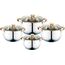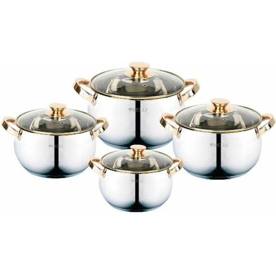 Набор из 8 предметов; Кастрюля 2,1л, диаметр крышки 16см; Кастрюля 3л, диаметр крышки 18см; Кастрюля 4л, диаметр крышки 20см; Кастрюля 6,2л, диаметр крышки 24см; Высококачественная нержавеющая сталь 18/10; Жаропрочные стеклянные крышки с паровыпуском; 5-ти слойное капсульное дно; Удобные термостойкие клепаные ручки; Подходит для всех видов кухонных плит.