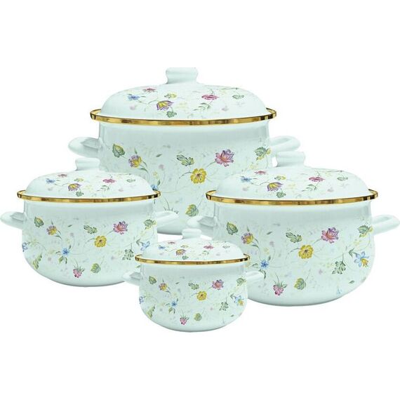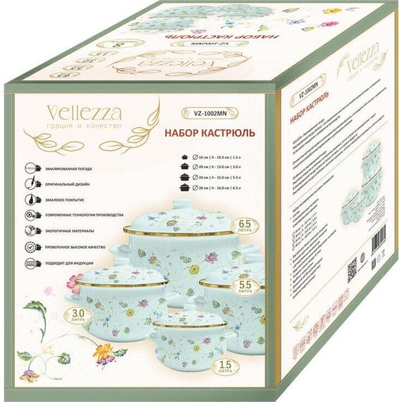 Набор кастрюль VELLEZZA MENTHOL 8 предметов: 4 эмалированные кастрюли 4 эмалированные крышки Размеры: Ø 16 | h-10.3 см | 1.5 л Ø 20 | h-13.0 см | 3.0 л Ø 24 | h-15.0 см | 5.5 л Ø 26 | h-16.0 см | 6.5 л Внутреннее белое эмалевое покрытие Внешнее цветное эмалевое покрытие с декоративным орнаментом Защитный металлический обод вокруг кастрюли Толщина стенок посуды 0.9 мм Удобные полые ручки Цельнолитой бесшовный корпус Подходит для всех видов плит, включая индукционные