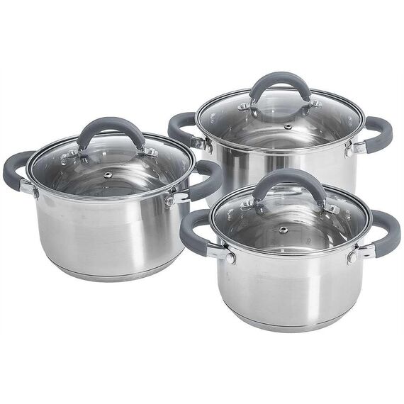 В наборе 6 предметов: кастрюля со стеклянной крышкой 16×10,5см; 2,2л кастрюля со стеклянной крышкой 18×11,5см; 3,0л кастрюля со стеклянной крышкой 20×12,5см; 4,0л Толщина стали 0,5 мм Набор кастрюль из высококачественной нержавеющей стали со стеклянными крышками Специальная форма, исключающая скопление остатков пищи и жира Эргономичный дизайн Термосберегающее дно: пятислойное дно с повышенной термоотдачей Быстрый нагрев пищи, длительное удержание тепла Минимальные потери минеральных веществ, витаминов и вкусовых качеств Подходят для использования на всех типах кухонных плит, включая индукционные Подходят для мытья в посудомоечной машине Серия: Profi Упаковка: цветная коробка