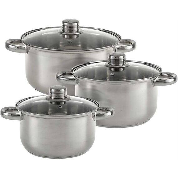 Набор посуды 6 предметов: 3 кастрюли (2,6 л, 3,5 л, 4,2 л) из нержавеющей стали со стеклянными крышками WEBBER BE-632/6 Параметры В наборе 6 предметов: кастрюля с крышкой 18×10,5 см; 2,6 л кастрюля с крышкой 20×11,5 см; 3,5 л кастрюля с крышкой 22×11,5 см; 4,2 л Толщина стали 0,3 мм Описание Набор кастрюль из высококачественной нержавеющей стали со стеклянными крышками Серия: Classic Термосберегающее дно: трехслойное дно с повышенной термоотдачей Стеклянная крышка с отверстием для отвода пара позволяет поддерживать оптимальный процесс нагрева Специальная форма, исключающая скопление остатков пищи и жира Обод, препятствующий переливанию жидкостей через край Быстрый нагрев пищи Минимальные потери минеральных веществ, витаминов и вкусовых качеств Можно использовать на электрических, газовых, керамических плитах Нельзя использовать на индукционных плитах Подходят для мытья в посудомоечной машине Упаковка: цветная коробка