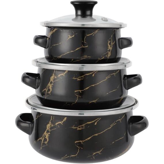 Набор посуды из 6 предметов. Кастрюля: 0,5л.; Стеклянная крышка: 12см.; Кастрюля: 0,7л.; Стеклянная крышка: 14см.; Кастрюля: 1,1л.; Стеклянная крышка: 16см.; 3-х слойное внешнее эмалированное покрытие; 3-х слойное внутреннее эмалированное покрытие; Подходит для индукционных плит