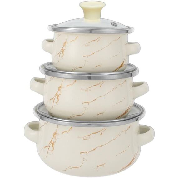 Набор посуды из 6 предметов. Кастрюля: 0,5л.; Стеклянная крышка: 12см.; Кастрюля: 0,7л.; Стеклянная крышка: 14см.; Кастрюля: 1,1л.; Стеклянная крышка: 16см.; 3-х слойное внешнее эмалированное покрытие; 3-х слойное внутреннее эмалированное покрытие; Подходит для индукционных плит