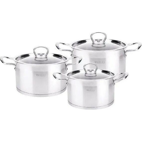 Набор посуды 6 предметов; Кастрюля 2,1 л Диаметр 16 см; Кастрюля 3 л Диаметр 18 см; Кастрюля 4 л Диаметр 20 см; Высококачественная нержавеющая сталь; Жаропрочные стеклянные крышки с паровыпуском; 5-ти слойное капсульное дно; Удобные термостойкие клепаные ручки; Зеркальная+матовая полировка; Пригодна для всех видов плит