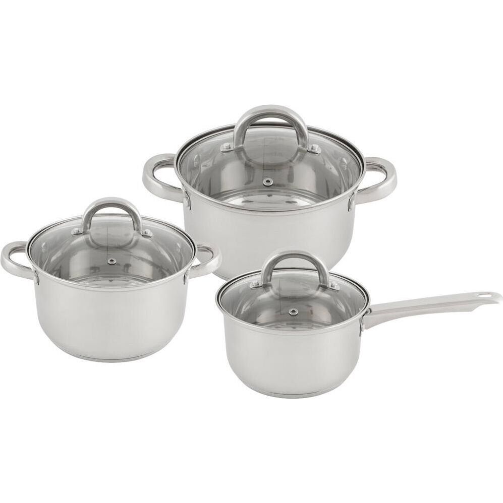 Набор посуды из нерж стали из 6 предметов, MEDIANO-SET-6 (ковш1,9л/кастрюли - 2,6 и 3,6 л), тм Mallony Высота стенок без крышек - ковш 9,5 см, кастрюля 2,6 л - 10,5 см, кастрюля 3,6 л - 11,5 см. Ковш с крышкой - 16*9,5 см размер, литраж 1,9 л + Кастрюля с крышкой - 18*10,5 см размер, литраж 2,6 л + Кастрюля с крышкой - 20*11,5 см размер, литраж 3,6 л. 201 нержавеющая сталь, толщина - 0,35 мм, дно 3-слойное капсулированное - 201 нерж сталь+ 1мм алюминия + 430 сталь, подходит для индукции, снаружи и внутри - зеркальная полировка, отметки литража; полые ручки из нерж стали, С-тип крышка из жаропрочного стекла с отверстием для выпуска пара. Не рекомендуется мыть в посудомоечной машине Упаковка - цветная коробка.