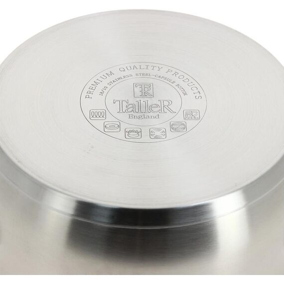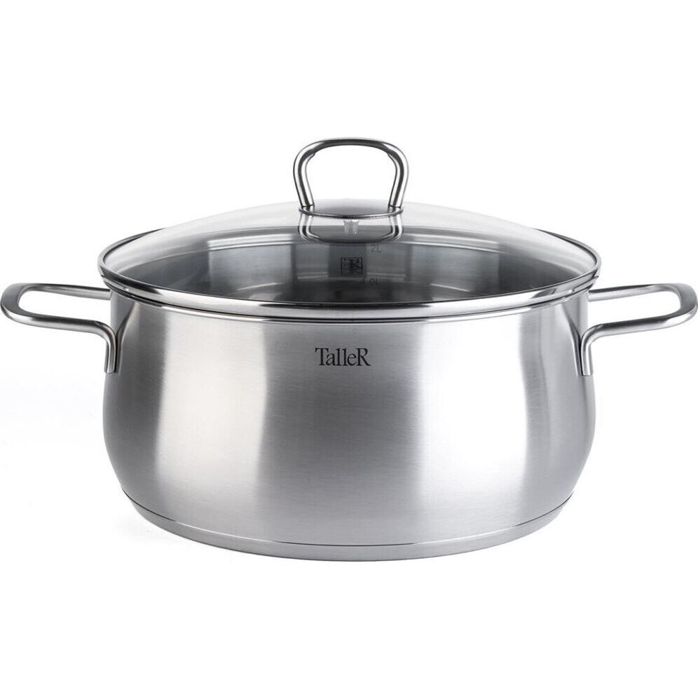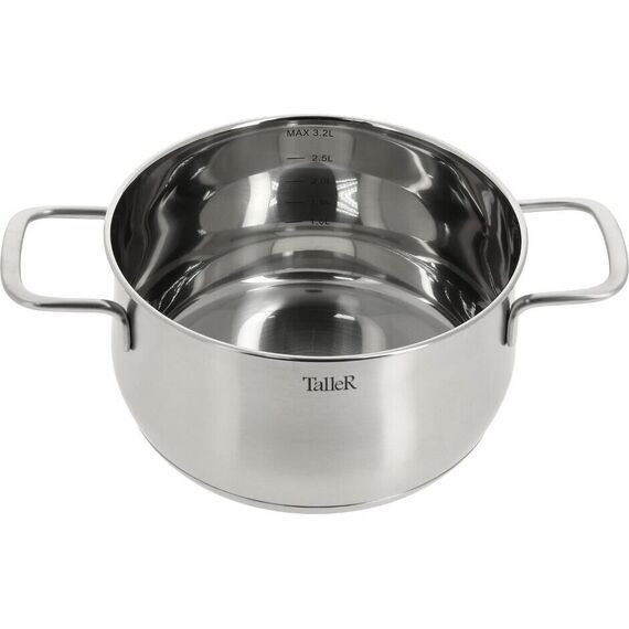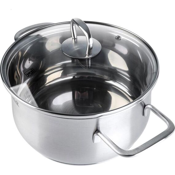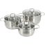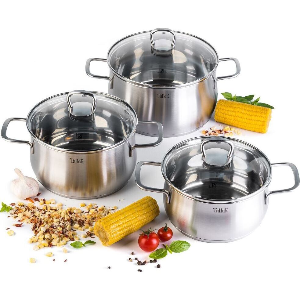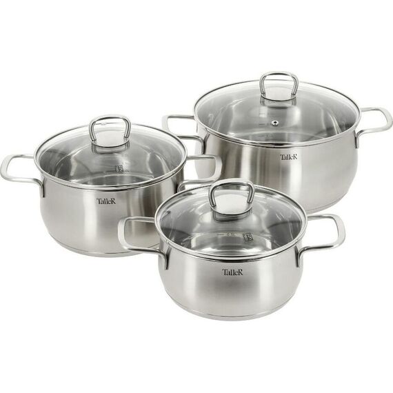 Набор посуды "Бригг", 6 пр Состав: 18*9 кастрюля с крышкой (2.2L), 20*10.5 кастрюля с крышкой (3.2L), 24*11.5 кастрюля с крышкой (5,2L) Толщина стенки — 0,6 мм, толщина дна — 2,8 мм. Полировка матовая снаружи, зеркальная внутри. Крышки из жаропрочного
