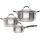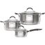 Набор посуды Лира. Состав набора: ковш с крышкой 1.35л, кастрюля с крышкой 2,8 л, кастрюля с крышкой 4.7л Материал - нержавеющая сталь. Толщина стенок 0.5 мм Толщина дна 4,0 мм Подходит для всех типов плит, в т.ч. индукционной. Упаковка - цветная короб