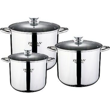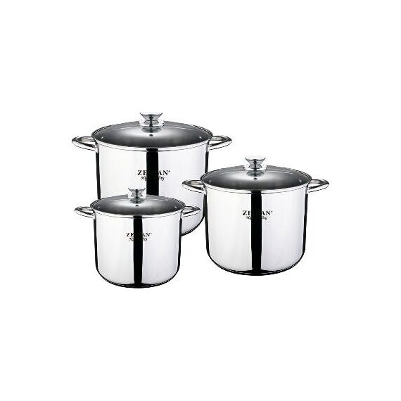 Набор посуды ZEIDAN Z-50640 6 предметов, Набор кастрюль, 6 предм. (3 КАСТРЮЛИ С КРЫШКАМИ: 7.5 Л (d22 см ), 9.5 Л (d24 см ), 12.0 Л (d26 см ), нержавеющая сталь, 3-x СЛОЙНОЕ КАПСУЛИРОВАННОЕ ИНДУКЦИОННОЕ ДНО, крышки - стекло, комбинированная полировка снаружи, матовая полировка внутри, шкала литража. Подарочная упаковка.