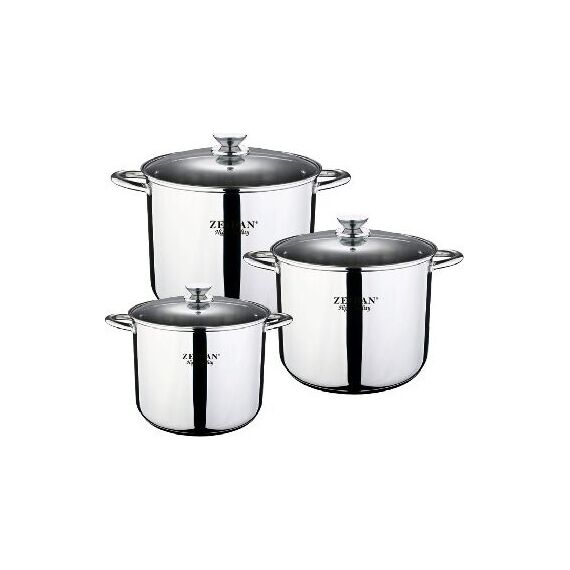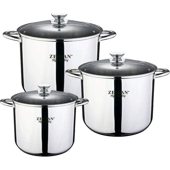 Набор посуды ZEIDAN Z-50641 6 предметов, Набор кастрюль, 6 предм. (3 КАСТРЮЛИ С КРЫШКАМИ: 9.5 Л (d24 см ), 12.0 Л (d26 см ), 14.0 Л (d28 см ), нержавеющая сталь, 3-x СЛОЙНОЕ КАПСУЛИРОВАННОЕ ИНДУКЦИОННОЕ ДНО, крышки - стекло, комбинированная полировка снаружи, матовая полировка внутри, шкала литража. Подарочная упаковка.