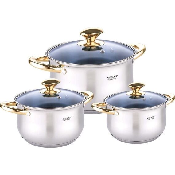 Набор посуды ZEIDAN Z-50644 6 предметов, Набор кастрюль, 6 предм. (3 КАСТРЮЛИ С КРЫШКАМИ: 3,0 Л (d18 см ), 4,0 Л (d20 см ), 6,1 Л (d24 см ), нержавеющая сталь, 3-x СЛОЙНОЕ КАПСУЛИРОВАННОЕ ИНДУКЦИОННОЕ ДНО, цветная стеклянная крышка с ручкой "ПОД ЗОЛОТО", ручки на корпусе "ПОД ЗОЛОТО", зеркальная полировка снаружи, матовая полировка внутри, шкала литража. Подарочная упаковка с ручкой.