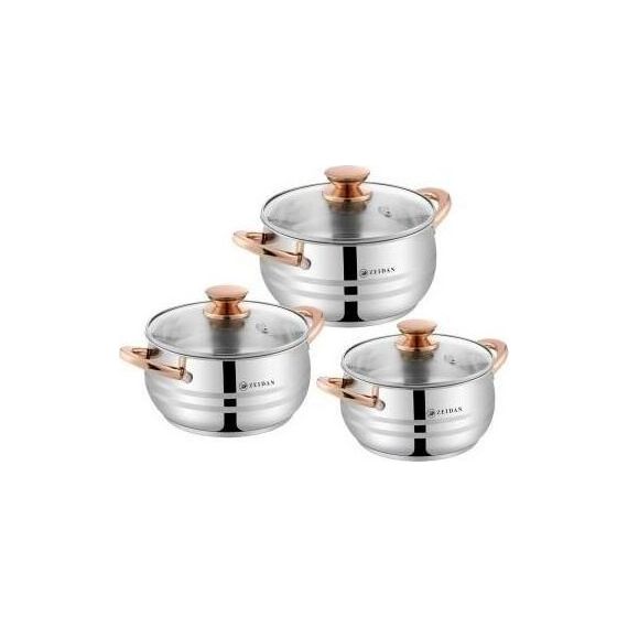 Набор посуды ZEIDAN Z-50657 6 предметов, Набор кастрюль, 6 предм. (3 КАСТРЮЛИ С КРЫШКАМИ: 2.0 Л (d16 см ), 2,7 Л (d18 см ), 3,6 Л (d20 см ), нержавеющая сталь, 3-x СЛОЙНОЕ КАПСУЛИРОВАННОЕ ИНДУКЦИОННОЕ ДНО, крышки - стекло, ручки на корпусе и крышке "ПОД ЗОЛОТО", комбинированная полировка снаружи, матовая полировка внутри. Подарочная упаковка.