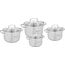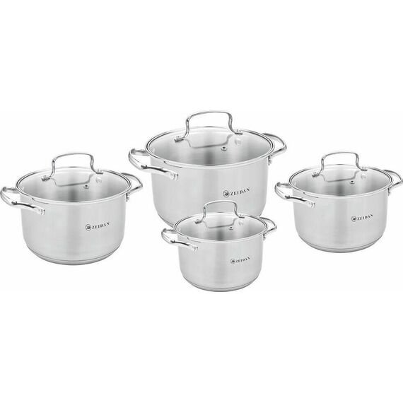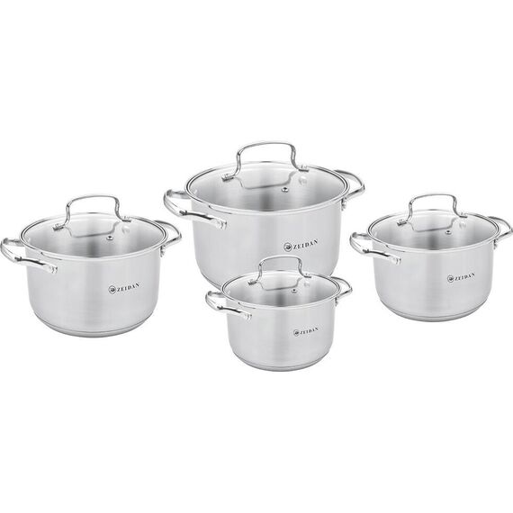 Набор посуды ZEIDAN Z-50822 8 предметов, Набор посуды, 8 предм. (4 КАСТРЮЛИ С КРЫШКАМИ: 4,0 Л (Ø20 см ), 5,1 Л (Ø22 см), 6,6 Л (Ø24 см ), 8,2 Л (Ø26 см ), нержавеющая сталь, 5-ти СТЕПОВОЕ КАПСУЛИРОВАННОЕ ИНДУКЦИОННОЕ ДНО, крышки - стекло, ручки на корпусе и крышке металлические, комбинированная полировка снаружи, матовая полировка внутри. Подарочная упаковка.